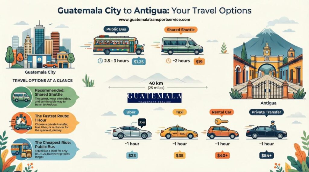 Uber is available in Guatemala, and a trip from Guatemala City to Antigua costs around USD 23 outside peak times.
